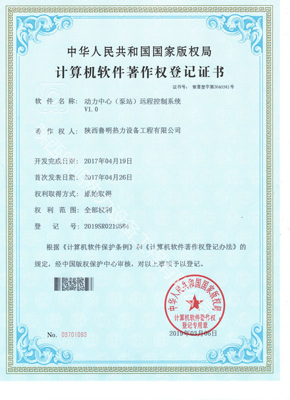 在公司今年战略目标----动力中心智能化成都大力提升指导思想下,公司生产研发部同仁通过不断试验、验证,最终编写定稿的计算软件-----《动力中心(泵站)远程控制系统V1.0》软件著作权登记喜获中国国家版权局审核批准。