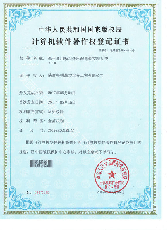 基于通用模组低压配电箱控制系统计算机软件著作权登记证书