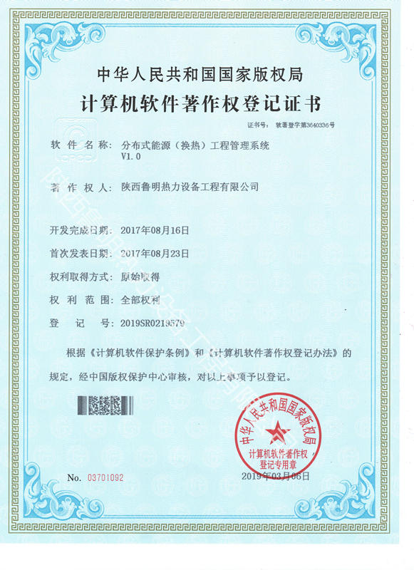 分布式能源(换热)工程管理系统软件著作权登记证