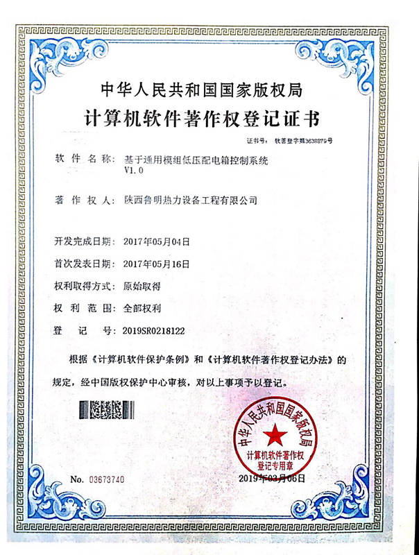 在我公司生产研发部同仁的共同努力及公司领导的大力支持下,我公司《基于通用模组低压配电箱控制系统V1.0》计算机软件著作权登记喜获中国国家版权局审核批准。