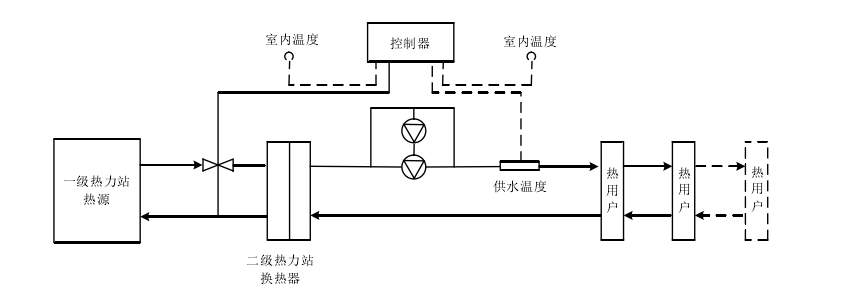 在集中供热系统中,热源厂将一次热源水处理至高温高压状态,经过一次热源首站及热网送至各个子换热站处,经过换热站的热交换,热量被输送到二次热网循环水中,再由二次网将热水送至各用户处。冷却后的二次网循环水通过二次回水网返回至换热站中,换热站的系统简图如图2.1所示。