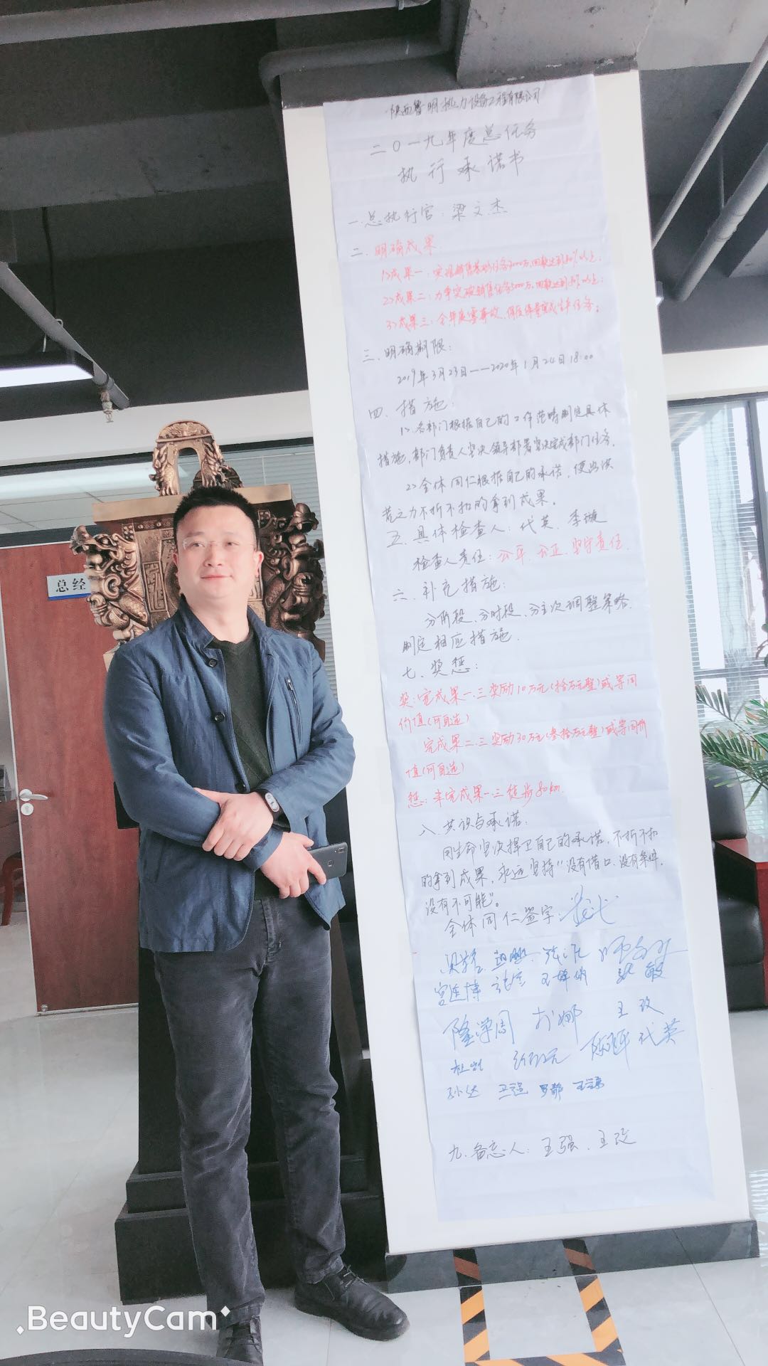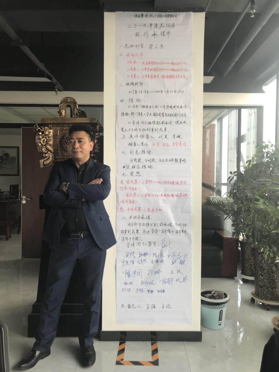 各部门根据各自的工作性质签订了目标任务书并公布了具体的实施计划。市场部对销售任务做出了详细的时间阶段划分、各阶段重点工作布置;生产部详细划分了阶段性配电销售任务;工程部签订了全年度零事故、保质保量完成生产任务的目标责任书;技术部签订了全力以赴配合销售工作做好技术支撑目标责任书;办公室签订了做好销售后台支撑保障目标责任书;财务部作为销售总任务各个环节的监督执行检查官。全年度销售总任务完成后奖励如下:完成总任务①、③项所有人员除绩效、提成外公司拿出10万元作为额外奖励基金;完成总任务②、③项所有人员除绩效、提成外公司拿出30万元作为额外奖励基金;全年度销售总任务完不成处罚如下:公司全体员工在 总经理的带领下徒步80公里。全体与会同仁在承诺书签字并在承诺书前宣誓:用生命坚决捍卫自己的承诺,不折不扣的拿到成果,永远坚持“没有借口,没有条件,没有不可能。”全体同仁在承诺书前合影留念,本次誓师大会全程录像备查。