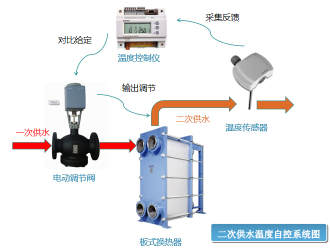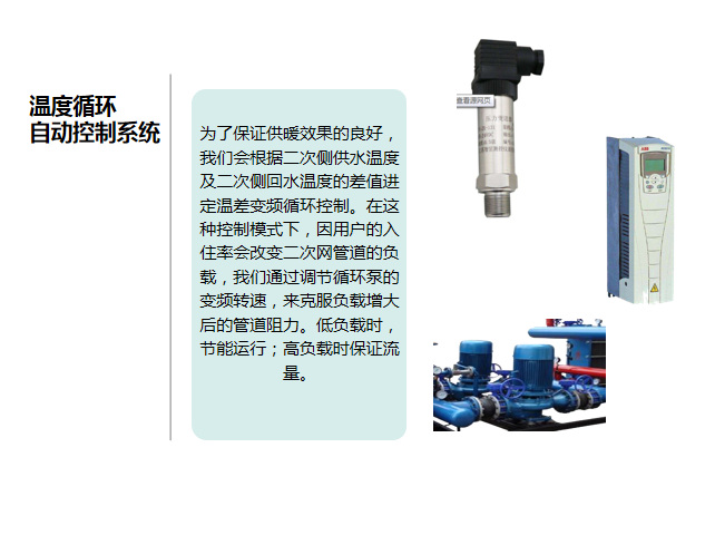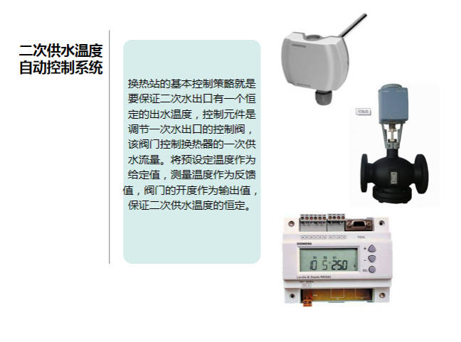 2.3换热系统控制:4台换热设备根据二次侧供回水温度的不同,在换热器一次侧入口处加装电动调节阀,根据二次侧供水温度/回水温度,控制一次侧供水流量,保证二次侧供热稳定。